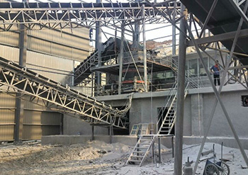 花崗巖原料由顎破破碎后經(jīng)中轉(zhuǎn)料倉進入單缸液壓圓錐破HST100,將10-20mm直接篩走作為成品石子,0-10mm,20-30mm經(jīng)皮帶機進入中專料倉進高效制砂機VSI5X9532,出料再返回振動篩篩分,然后成品進洗砂機水洗后經(jīng)皮帶機輸送至成品料堆。