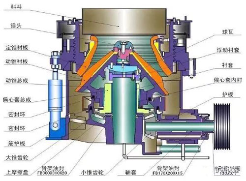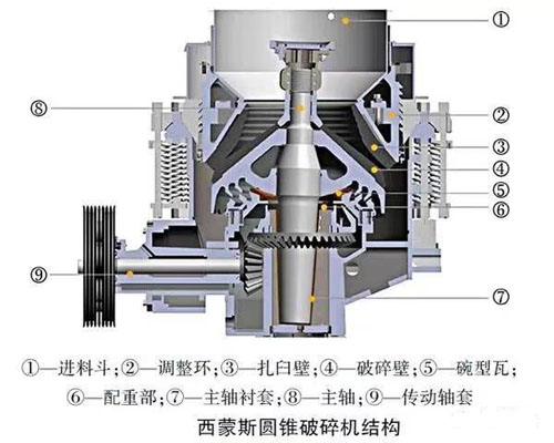 該機的缺點是能耗較高,機器笨重,產量也偏低。隨著圓錐破碎機日益高能化的發(fā)展方向,該機也將逐漸被液壓圓錐破碎機取代。