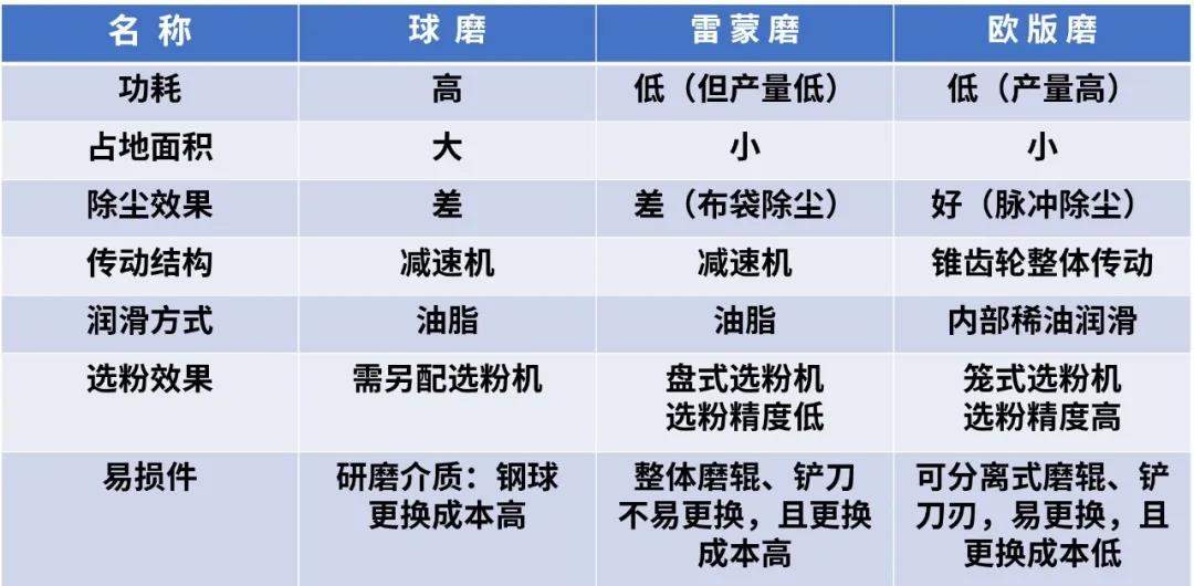 相對于球磨機,雷蒙磨雖然占地面積小、功耗小,但因其傳動不穩定(減速機傳動)、維護頻次高、單臺產量低、易損件更換成本高等因素,也逐漸不被市場所接受。