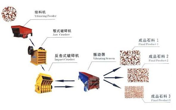 大塊石料經(jīng)料倉由振動(dòng)給料機(jī)均勻的送進(jìn)顎式破碎機(jī)進(jìn)行粗碎,粗碎后的石料由輸送機(jī)送到反擊式破碎機(jī)進(jìn)行進(jìn)一步破碎,細(xì)碎后的石料由輸送機(jī)送到振動(dòng)篩進(jìn)行篩分,篩分出幾種不同規(guī)格的石子,滿足顆粒要求的石子,由成品輸送機(jī)送往成品料堆,不滿足顆粒要求的石子,由輸送機(jī)返料送到反擊式破碎機(jī)進(jìn)行再次破碎,形成閉路多次循環(huán),成品粒度可按照用戶的需求,進(jìn)行組合和分級(jí),為保護(hù)環(huán)境,可配置輔助的除塵設(shè)備。