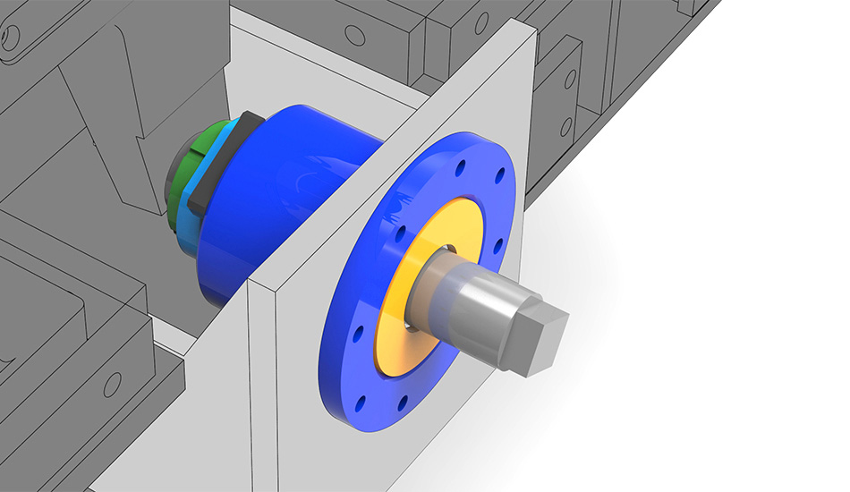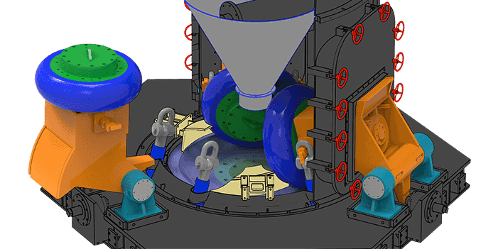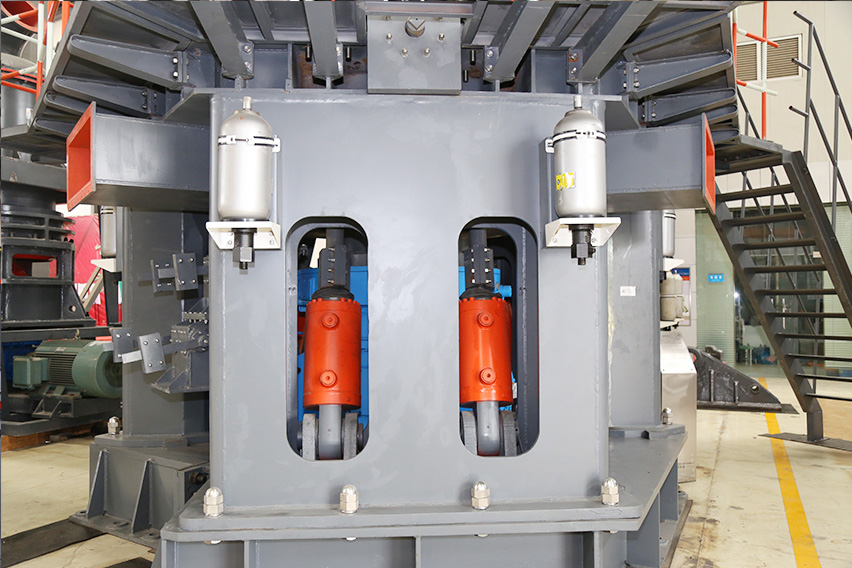 該機(jī)設(shè)計(jì)過(guò)程中我們充分考慮重型磨輥可能帶來(lái)的養(yǎng)護(hù)難題,最終開(kāi)發(fā)設(shè)計(jì)了可翻轉(zhuǎn)結(jié)構(gòu)。該結(jié)構(gòu)配合液壓調(diào)整系統(tǒng),操作員可輕松、快捷的將磨輥翻出機(jī)殼外部進(jìn)行檢修,更換輥套、襯板等養(yǎng)護(hù)操作,減少停機(jī)損失。